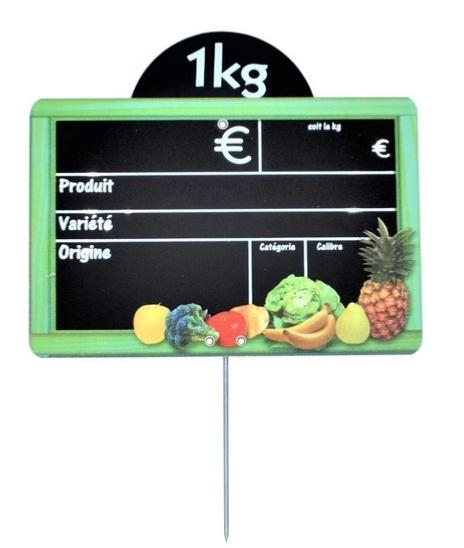 Ecriture sur fond noir au feutre-craie pour une réutilisation continue et offrant une visibilité optimale; elle est principalement adaptée pour les primeurs.