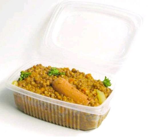 100% recyclable avec couvercle rattaché pouvant contenir jusqu'à 800grs d'aliments. Elle est compatible au micro-ondes de par ses propriétés thermo résistantes et peut supporter des températures allant de -20°C à +120°C. Certifiée conforme au contact alimentaire, elle est conçue de manière transparente pour mettre en valeur les produits, ce qui la rend idéale pour tout type de préparation chaude ou pour la vente à emporter.