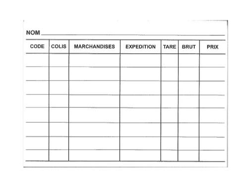 Idéal pour tous commerçants et particulièrement pour les commerces de gros.Conçu avec un socle cartonné. Caractéristiques affichées : Nom - Code - Colis - Marchandises - Expédition - Tare - Brut - Prix.