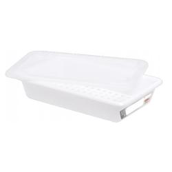 De fabrication 100% Française et certifié conforme au contact alimentaire, ce couvercle pour bac alimentaire d'une capacité de 5L est fourni avec un certificat d'alimentarité comprenant les tests de migrations conformes aux normes Européennes. C'est un accessoire sans bisphenol A, conçu en PEHD de type 2, entièrement recyclable et ultra résistant, pouvant supporter des températures allant de -40°C à +90°C. Sa surface est revêtue d'une fine couche en mélaminé anti adhérente, idéale pour les aliments à corps gras et collants tels que les viandes. A laver avant la 1ère utilisation.